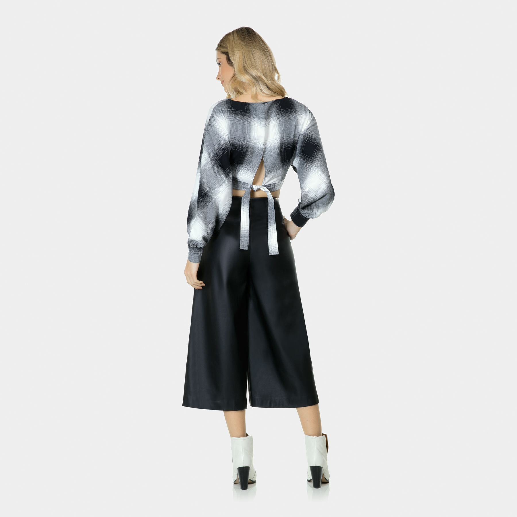 ★ ★ ★ ★ ★Blusa de manga longa cropped em tecido com padronagem xadrez inspirada no mood western do Arizona. A amarração nas costas proporciona caimento perfeito e a dica é combiná-la com peças de cintura alta.