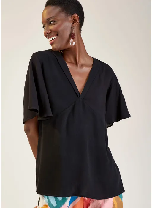 A BLUSA APRESENTA DECOTE EM FORMATO V E MANGAS CURTAS COM A MODELAGEM SOLTINHA, TRAZENDO ESSE EFEITO DE BABADO.